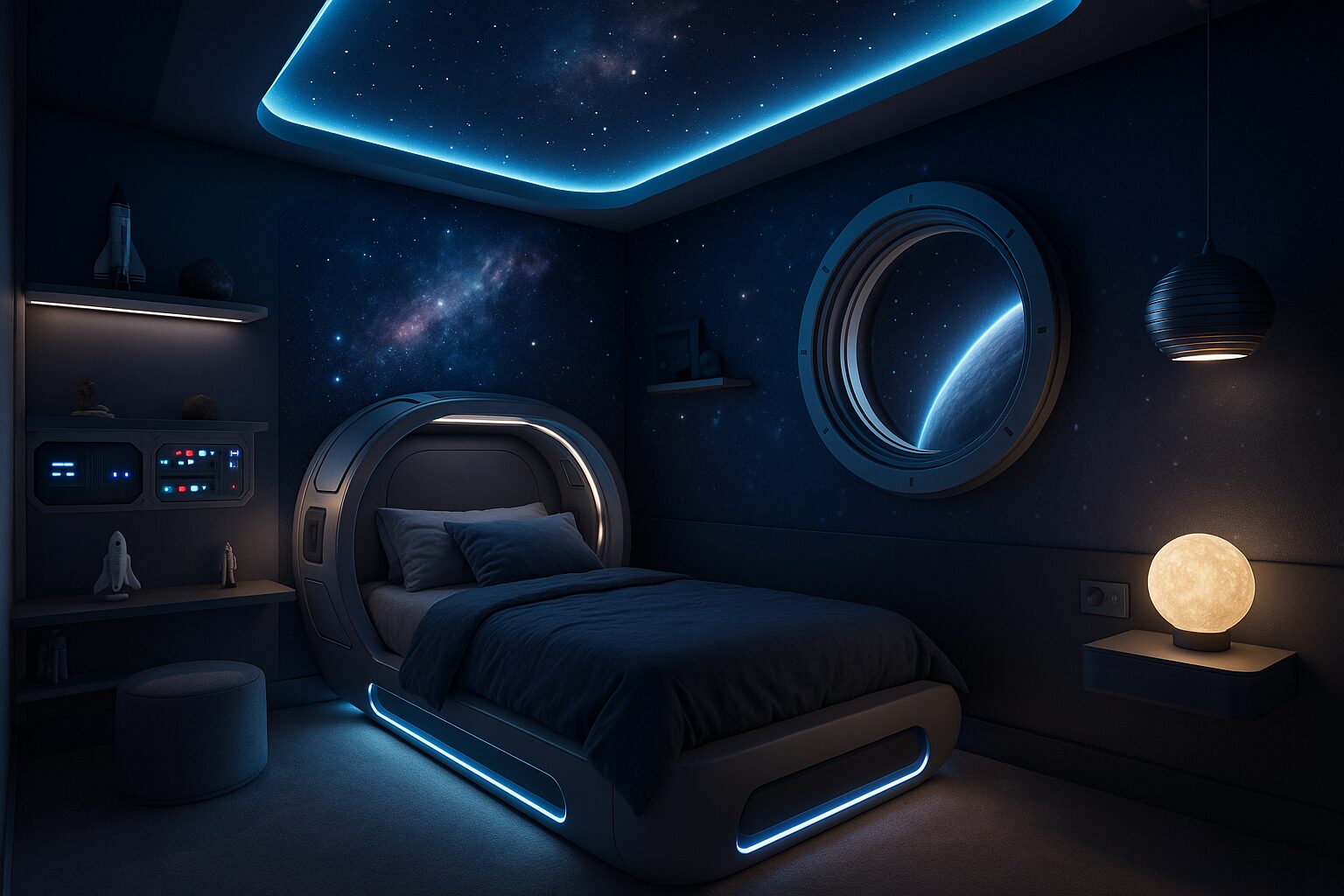 A spaceship-themed bedroom can transport its occupant — child or adult — into a world of imagination, wonder, and futurism. Whether you’re creating a playful escape for a child or a high-design concept room for a boutique rental, this theme offers endless creative potential.
