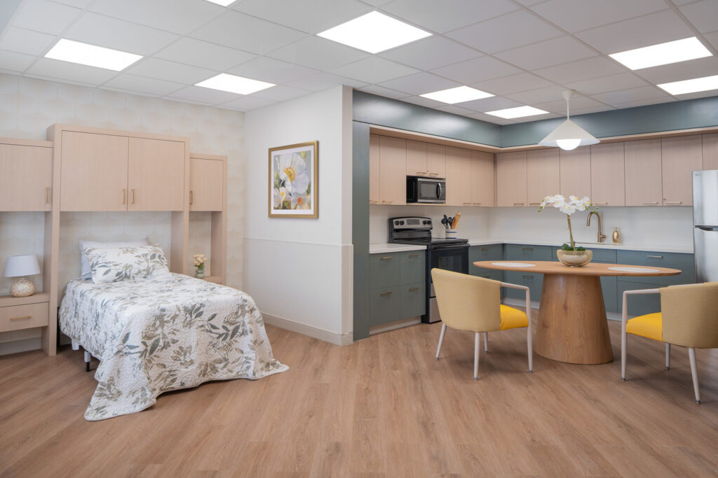 Strategic layout improvements—such as opening walls and enhancing service adjacencies—improved workflow and visibility while strengthening staff-resident interaction. The result is a thoughtfully coordinated interior that balances efficiency, warmth, and a sense of home across the facility.