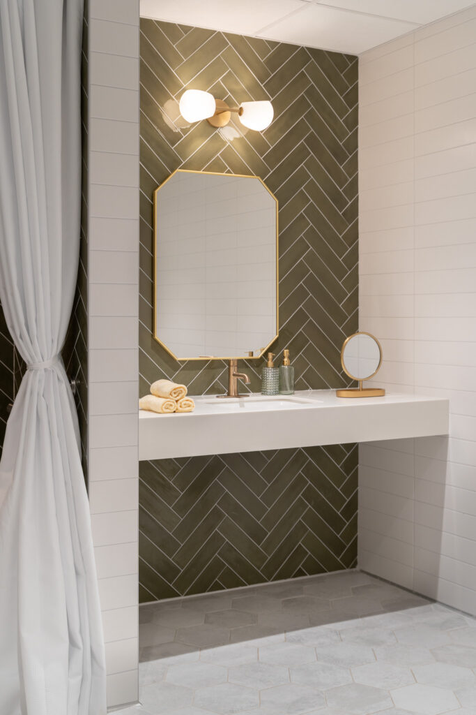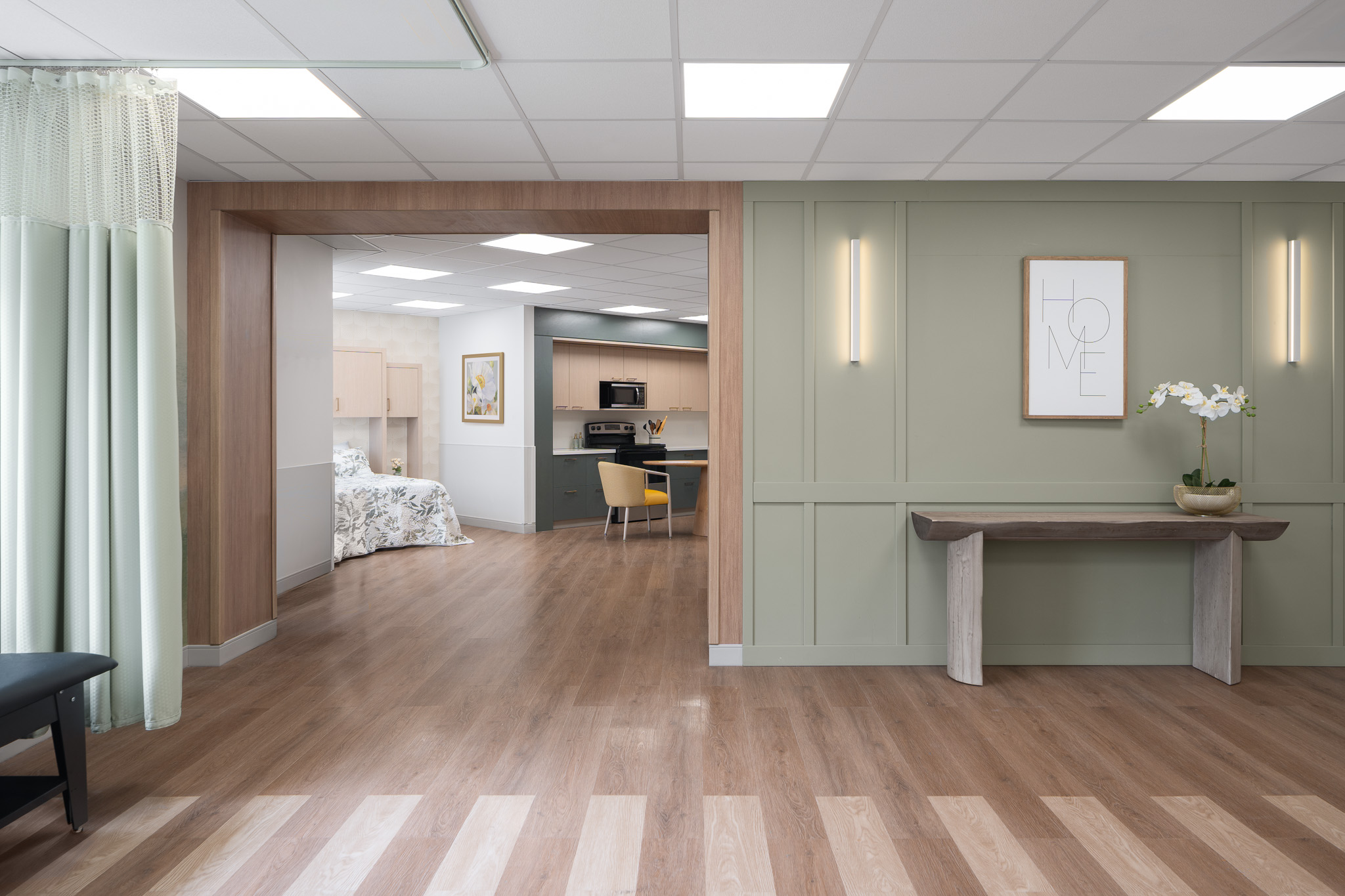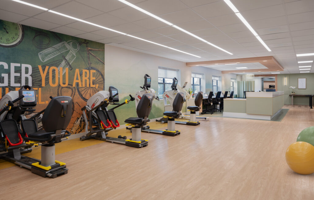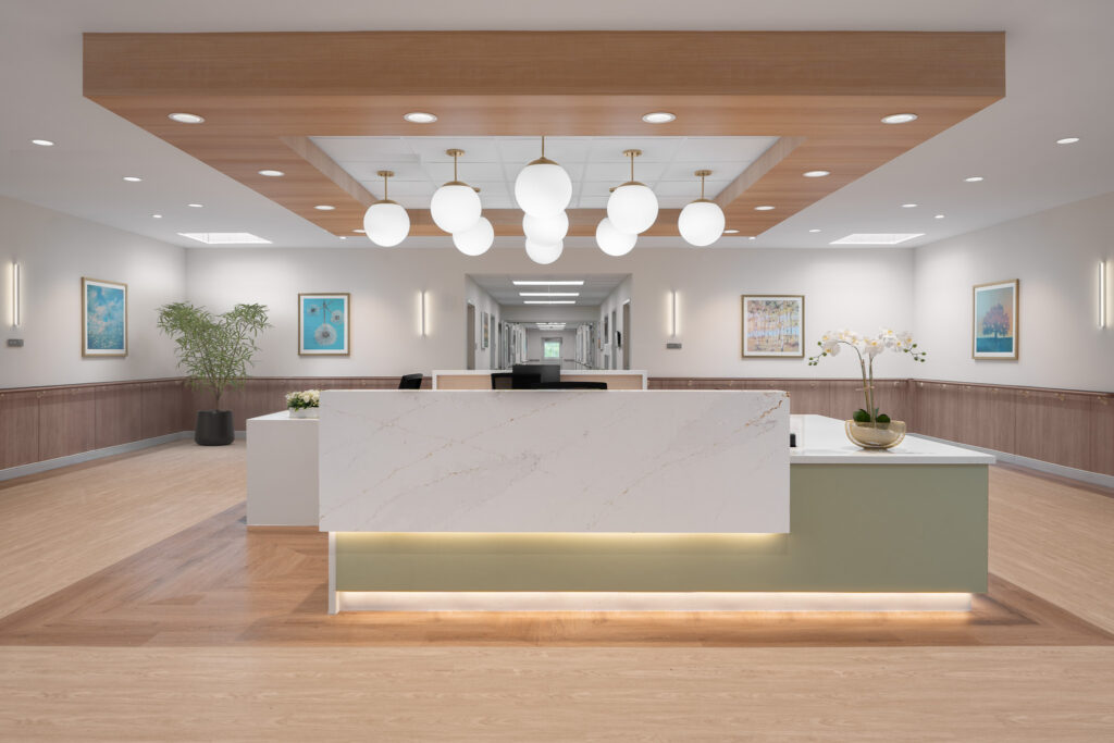 Throughout the facility, a light, calming palette, wood-look flooring, modern lighting, and curated artwork create a cohesive and welcoming atmosphere. Resident rooms were designed to feel residential and restorative, while shared spaces encourage connection and ease of use for both residents and staff.